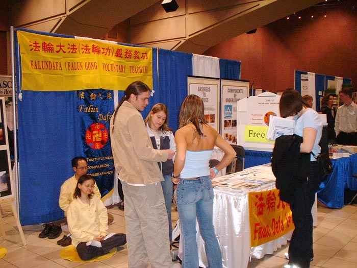【明慧网2004年4月1日】3月26-28日,为期三天的健康博览会(BODY,MIND,SPIRIT EXPO)在加拿大亚省首府埃德蒙顿举行。在近百个展位中,法轮大法的展位显得格外的引人注目。许多寻求身心健康的人们纷纷来到我们的展位前,了解功法的情况,有的当场学功,有的准备到炼功点学。学员们给每个来到展位的人