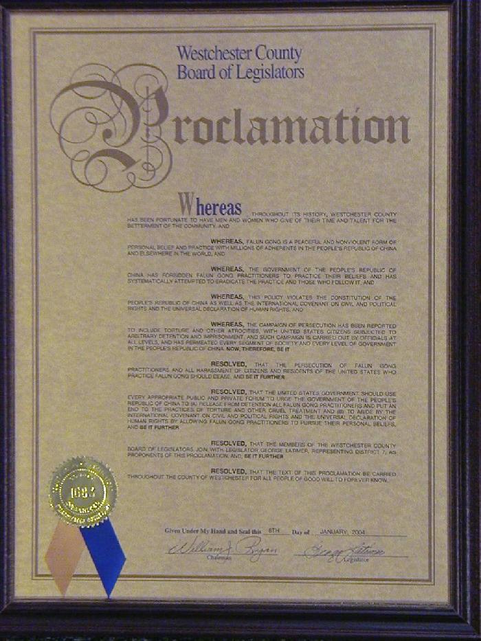 莱恩议长高度评价法轮功学员四年多来对社区作出的贡献。莱迪姆议员宣读了褒奖。褒奖指出,威斯特郡在他的历史中,十分有幸的有了一批为社区福祉贡献自己时间和天赋的人(法轮功学员)。褒奖还指出,中国政府(江氏集团)禁止法轮功学员的信仰,不但违反了中国自己的宪法,也违反了国际公约。褒奖谴责中国政府(江氏集团)迫害美国籍的法轮功学员,呼吁美国政府利用一切渠道要求中国政府停止迫害法轮功。褒奖最后希望威斯特郡全体善良的民众永远记住褒奖的内容。