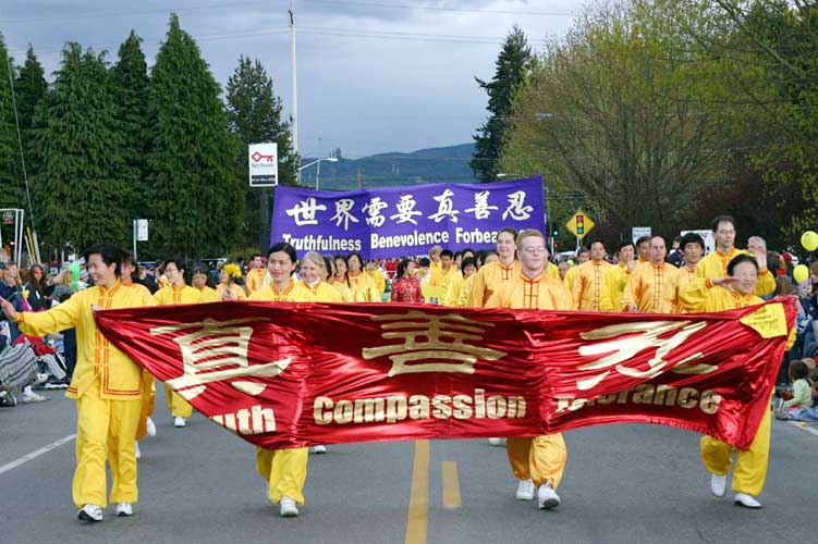 【明慧网2004年4月20日】2004年4月17日华盛顿州举办水仙花节。来自西雅图,加拿大温哥华,和俄勒冈州波特兰的部分法轮功学员参加了4城市(Tacoma,Puyallup,Sumner,Orting)的系列游行。所到之处,赢得了人们无数欢呼和掌声。赢得了人们无数欢呼和掌声并荣获“训练/行进组”(Drill Team/Marching Units)二等奖。