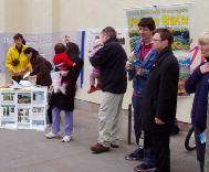 活动于中午12:00准时开始,在室内及室外两个地点学员们分别进行了表演。在室外的小广场上,学员们表演了舞蹈“飞旋的法轮”,无伴奏合唱“为你而来”及五套功法。四周的行人纷纷驻足观看,并来到展桌前了解真象,索取资料。一时间,人们竟在桌前排起了长队等候签名,以制止发生在中国的迫害。附近一位卖花的女士特地送来一束鲜花,并对学员说“谢谢你们,你们的表演太可爱了!”