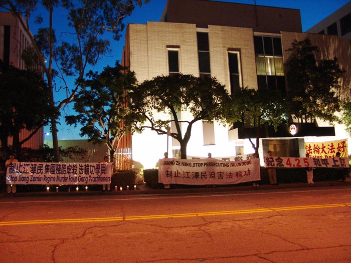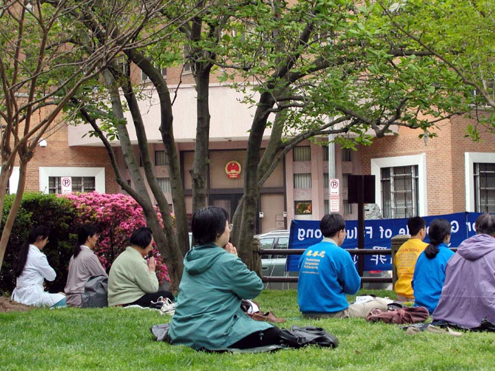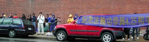 4月24日下午,大纽约地区大法弟子在中领馆前集会,展示4.25上访的历史和法轮功在5年中遭受的迫害。同时模拟审判江××,呼吁各界人士制止迫害。
