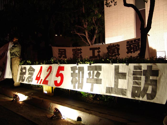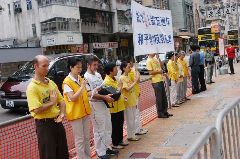 4月24日,香港大法弟子在中联办外进行和平请愿,纪念4.25五周年。