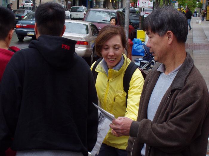 ![]() 过路人观看真象展板 | ![]() 学员接受采访 |