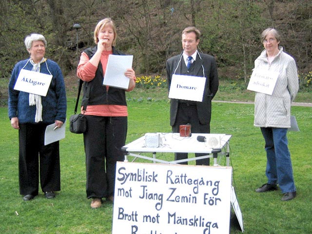 4月24日,瑞典哥德堡大法弟子在市中心繁华地带,模拟审判迫害法轮功学员的元凶江××,以纪念“4.25”五周年。