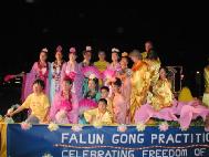 手持中英文“真善忍”横幅的学员走在法轮功队列的最前面,一辆披挂着横幅的红色敞篷车紧随其后。接下来是八位身着唐装的“天仙”在中国古乐声中表演扇子舞。紧接着是由手工制作的小型纸荷花和两朵大型荷花装点的花车,两名年轻学员坐在大型荷花上,其他学员身穿金黄色的炼功服表演五套功法。花车完全是由学员们义务装点的。
