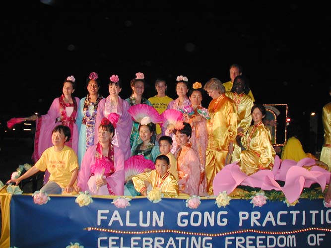 游行队伍经过评审台前时,游行主持人向大家介绍说:“法轮功是以“真、善、忍”为原则的中国传统打坐和炼功功法。世界上有五十多个国家有法轮功学员。法轮功曾荣获美国各州政府、各地官员以及世界各地颁发的上百份荣誉证书和褒奖。各个年龄层的人都感到修炼法轮功使他们身体健康,减缓压力,改善工作和学习,升华道德。谁能没有压力呢?这是法轮功头一次参加我们的游行活动。我们希望明年能再次见到他们。”