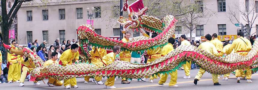 世界日报4月7日报道,华府第九十二届樱花节大游行,日前在春寒料峭、满城飞花的宪法大道上展开,樱花皇后、花车、鼓号乐队自是少不了的焦点,队伍中的龙腾狮舞,更为樱花节增添东方风采。