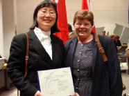 ![]() 周女士与所在选区市议员派姬-法特梅特女士(Peggy Feltmate)在颁奖仪式上合影。 | ![]() 渥太华市长签署、颁发的奖状。 |