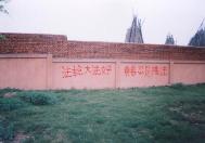 【明慧网2004年5月10日】下图为大法弟子在本地图绘的法轮功真象标语,历经很长时间没有被损坏。