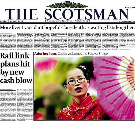 2002年,爱丁堡国际艺术节组委会向法轮功学员表演队颁发了该年度的「女王金禧庆典大游行」一等大奖。那一年是法轮功学员首次参加爱丁堡艺术节艺术表演,其清新华美的风格令评委一致予以极高评价。当时有近20万游人前往观看,是历届人数最多的一次。