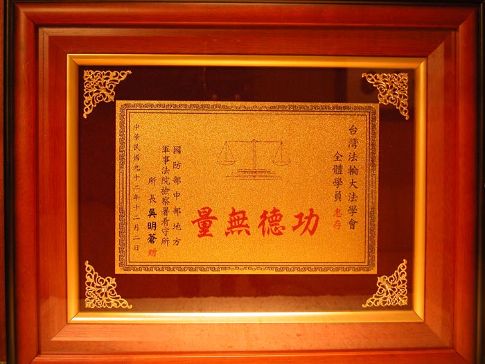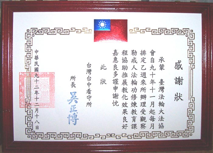 ![]() | 奖状 哈尔滨市法轮功辅导总站 一九九八年度 拾金不昧先进单位 哈尔滨市公安局 一九九九年三月四日 |
