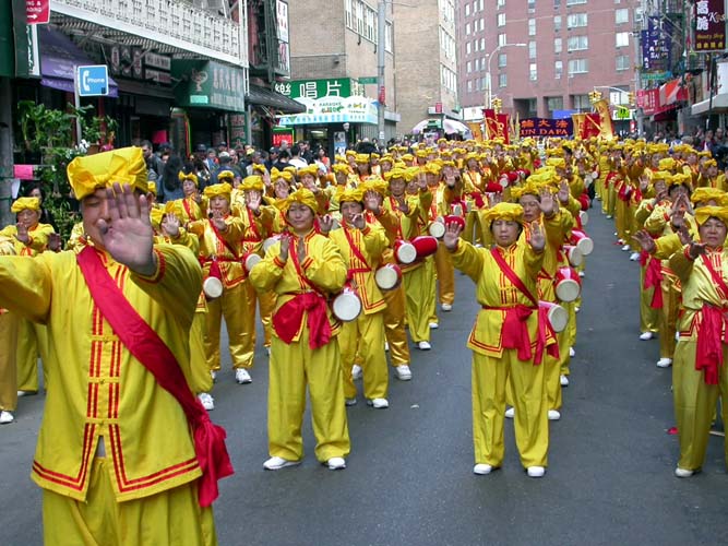 2004年4月10日下午,来自世界各地的约三千名法轮功学员在曼哈顿的中国城举行了以“正法之路”为主题的盛大游行,演示法轮功自1992年传出以来历经沧桑、悲壮辉煌的历程,引起了观众的极大反响,有的人被真人造型展示法轮功学员在中国大陆遭受的酷刑迫害所震动,有的人被美丽的舞蹈鼓乐等展现法轮功学员在被迫害中依然给世界带来乐观、希望与光明而感动得流泪。