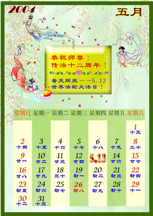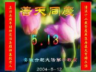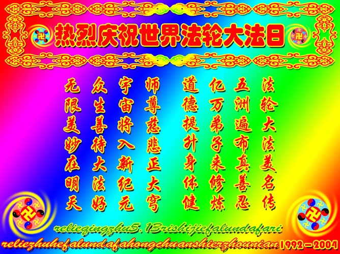 【明慧网2004年5月13日】(明慧记者古安如综合报道)五月十三日,世界迎来了第五个“世界法轮大法日”,这个在五年前由世界各国法轮功学员倡导订立的世界性节日,给人类带来了赞颂法轮大法、赞颂“真、善、忍”的美好机缘。