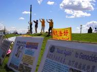 法轮功学员们按照申请的活动举办了三次介绍会,每一次都详细的介绍法轮功以及发生在中国大陆对法轮功的残酷迫害真象。会议完后,许多人找到摊位买书,询问和听取更多的真象。明白真象的人都谴责这场迫害。
