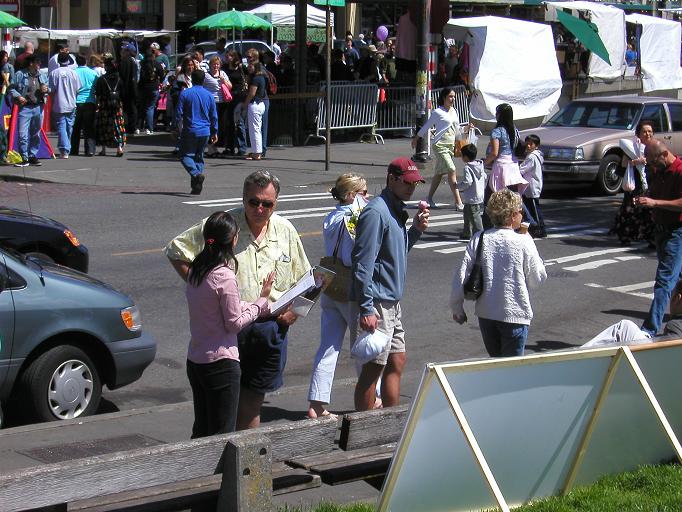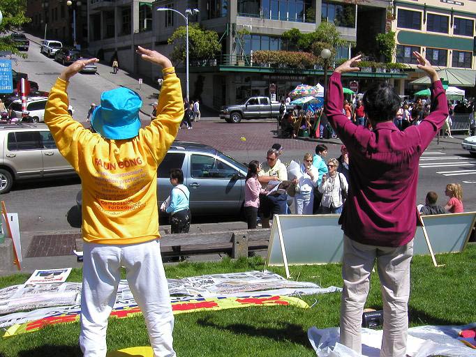 一般人经过摊位都会大声念摊位上写的法轮大法和真、善、忍。不时有人要求学员们教他们念法轮大法四个字和法轮大法好;这些人都想知道法轮大法是什么。时时摊位附近都听到法轮大法,法轮大法好的声音。