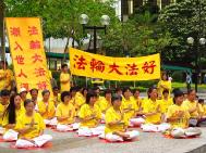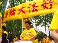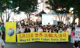 中国时报5月10日报道,来自全台湾各地约四千名法轮功弟子,九日齐聚在高市文化中心欢庆法轮大法十二周年纪念以及欢度母亲节。高雄市副市长林永坚以地主身分欢迎他们来到友善的海洋城市高雄,并赞扬他们抖擞的精神,显示大家都从“真善忍”中受福益。活动场面热闹,有四场次功法表演及精彩的腰鼓队展演外,莲花舞、彩带舞、法轮功旗阵、扇子舞、采茶舞、舞狮阵、气球阵、风车阵、剑阵、天使队数千人,沿著文化中心进行游行,宣扬法轮功真善忍。