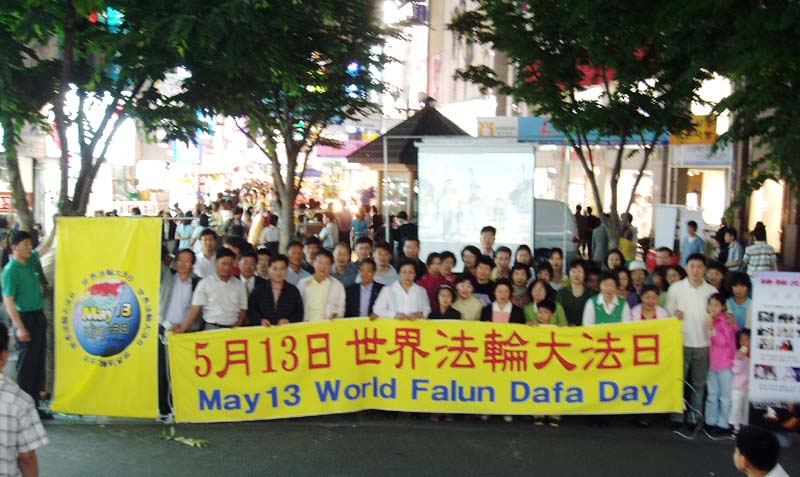 台湾各地的法轮功学员2004年5月9日齐聚南台湾的高雄市,庆祝法轮大法洪传十二周年。这次是台湾庆祝「世界法轮大法日」首度移师高雄市,举办了园游会、正法之路图片展,集体炼功及舞蹈表演、音乐会等一系列庆祝活动,声势浩大、内容精彩丰富的三千人大游行更将整个活动推至最高点:腰鼓队、花车、法轮功书籍《转法轮》巨幅模型、莲花舞、彩带舞、旗阵、扇子舞、法轮功洪传世界组图、采茶舞、舞狮阵、气球阵、风车阵、巨幅寿桃模型、剑阵、天使队、法轮功获颁1,223项褒奖阵等十六个富有节庆味道的游行阵容,展现法轮大法的美好。缤纷热闹的游行沿着市中心的主要道路上前进,绵延数公里长的队伍,引来不少市民的目光及掌声。