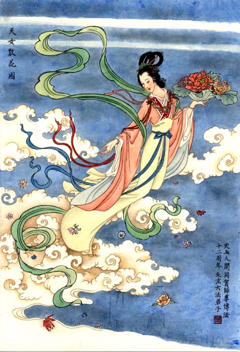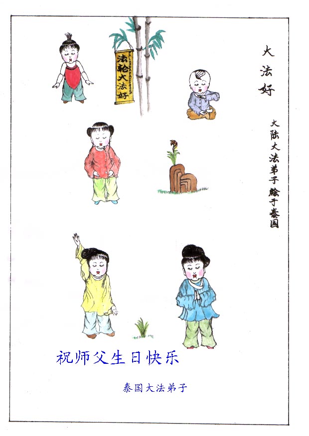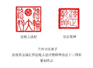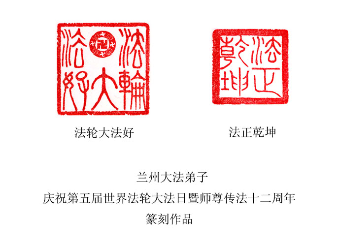 绘画:佛恩浩荡;天女散花大陆大法弟子刺绣作品四幅篆刻作品:法轮大法好;法正乾坤绘画:小弟子炼功对联:用尽弟子人间天上感恩语,难表师尊洪大慈悲苦度心绘画:献寿