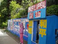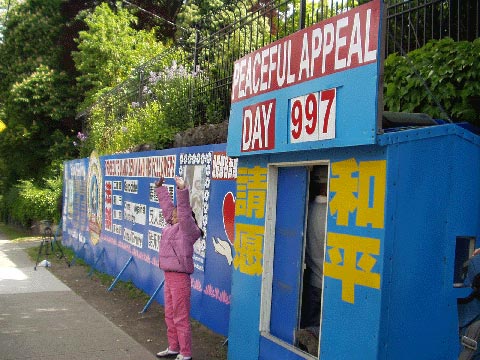温哥华中领馆前,有两个明显的景点,一个是法轮功学员静坐的小蓝屋和长年竖立着的一长排蓝色的展板。展板用醒目的黄字告诉过往行人:法轮大法的美好,大法在世界上60多个国家洪传;告诉人们大法弟子在中国受到的残酷迫害,呼吁共同起来制止迫害;展板还及时向人们报告江氏及其帮凶在国外被起诉的消息。巨大的花圈、一个个被迫害致死的学员的照片在向人们提示,这场暴行仍在继续。