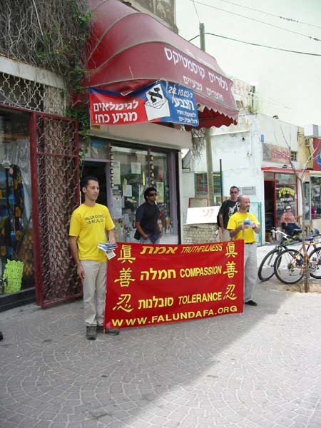 【明慧网2004年5月15日】5月13日和14日,以色列法轮大法学员在特拉维夫(Tel Aviv) 市举行了庆祝法轮大法日和讲真象的活动。5月14日晚,学员们在中国大使馆前请愿,呼吁停止