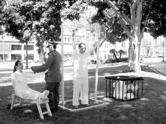 北加州医师李祥春是美国公民,被判刑三年,未婚妻符泳青参加车队。13日她绑上手脚坐在窄凳上,旁边还有名「公安」对她灌水。另一名法轮功学员坐在伸不直身体的笼子里,示范「蹲小号」。还有一人被铁链吊起双手,示范学员在大陆各监狱中受到不人道待遇。据法轮功统计,有真实姓名被害致死学员,有958人。