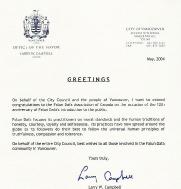 我代表市议会向温哥华全体法轮大法学员致以最美好的祝愿。