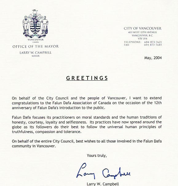 值此法轮大法洪传12周年之际,我代表温哥华市议会及全体市民向加拿大法轮大法协会祝贺。