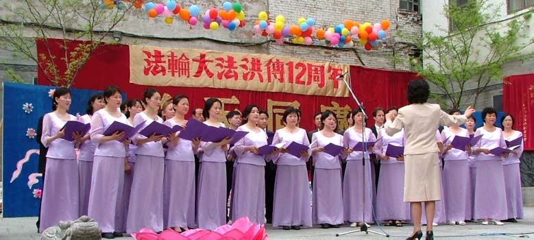 “今天法轮大法弟子们再一次与善良的人们一起欢聚,庆祝法轮大法传世12周年,庆祝法轮大法给人类带来的福音。在各式各样的庆祝活动中,我们愿把对法轮大法的感激化作对普天下善良人们的祝福。