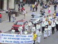 中午12点半在中国城表演节目之后,下午4点至6点,法轮功学员们在市中心大规模游行,受到人们的欢迎。