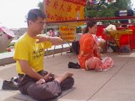 以色列各地的学员们在周末期间庆祝法轮大法传世12 周年。学员们在特拉维夫城人群熙攘的地方游行。他们在街上演示功法、跳舞和歌唱。街上的人们被大法的美好所吸引,纷纷索要有关大法和发生在中国的迫害的资料。当天,学员们发放传单并和许多人讲了真相。