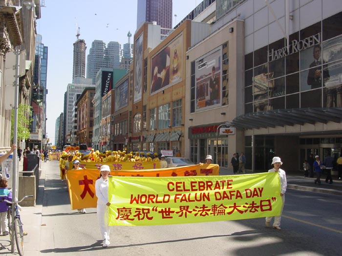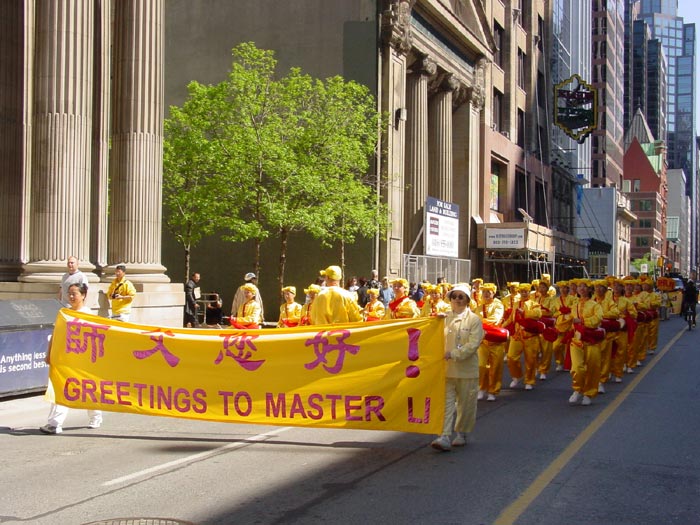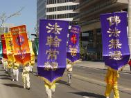 加拿大蒙特利尔法轮功学员5月15日举行游行活动,庆祝大法洪传十二周年。