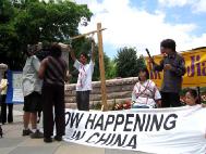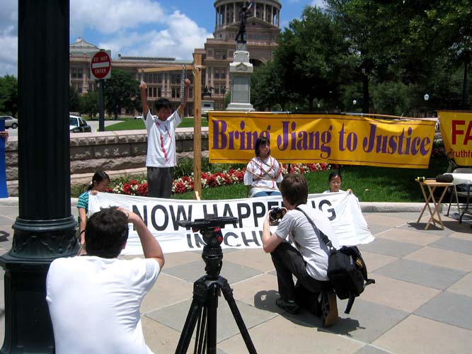 中午时分,“支持诉江汽车之旅”抵达德州的首府奥斯汀,同当地和圣安东尼奥的学员一同举行了新闻发布会,揭露江泽民对法轮功学员的惨无人道的迫害,同时,还举行了对江泽民的象征性公审,两位法轮功学员展示了中国监狱中的酷刑