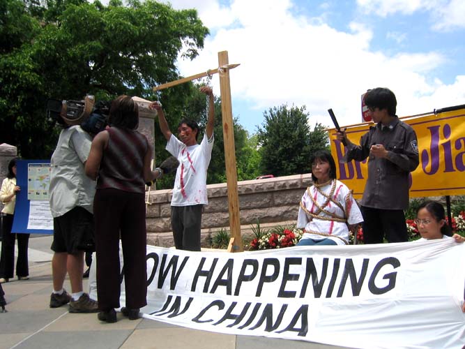 当地媒体对大法活动做过多次报导,而且大多对在中国发生的对法轮功的迫害有所了解,但是当记者们看到学员们扮演的展示江集团一伙迫害中国大陆法轮功学员的实地场面时,他们的心受到了深深的震撼。他们特意请学员打开电棍开关让当地民众能够更加身临其境的看到或联想到这些残酷的迫害正在中国发生。