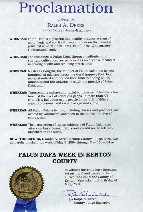 鉴于,法轮大法创始人李洪志大师已帮助世界各地上亿人增進健康、道德标准,并且使他们通过修炼法轮大法加深了对生活、人类和宇宙的理解,并且;