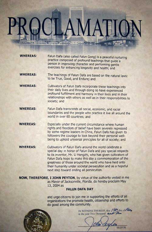 因此,现在,我,佛罗里达州杰克逊维尔市(Jacksonville)市长约翰-佩顿(John Peyton),依据赋予我的权力,特此宣布2004年5月13日为