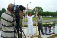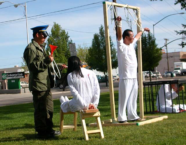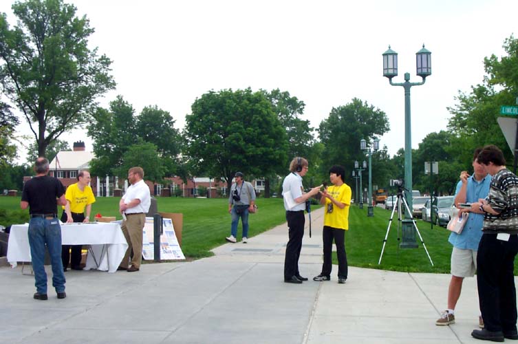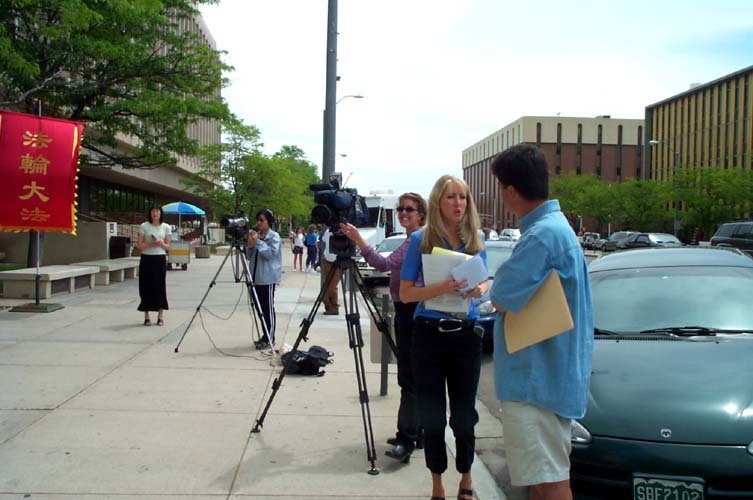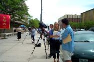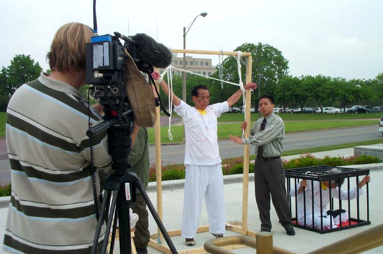 汽车之旅成员20日上午抵达爱荷华州的首府Des Moines市时,当地主流媒体FOX电视台的记者和摄影师在活动开始前就来到了活动现场。与“汽车之旅”的成员交谈后,记者叫摄影师从不同角度拍摄几种酷刑,并亲自认真的对各种酷刑進行解说。