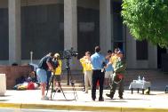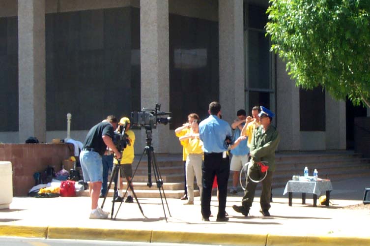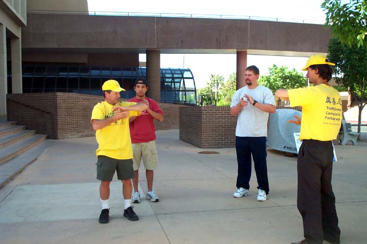 5月16日,星期天,“汽车之旅”抵达新墨西哥州和当地法轮功学员在新墨西哥州最大的城市Albuquerque的市政广场前,向人们展示宁静优美的法轮功功法,并真人模拟了法轮功学员在中国大陆遭受酷刑迫害的情景。该市2个主流媒体NBC和CBS到现场采访。一些过往的路人现场学功,还询问了炼功点的情况。