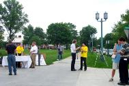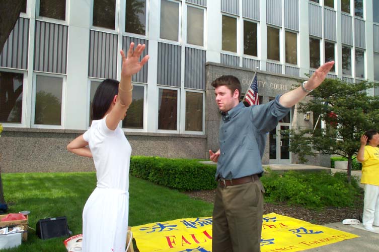 另一位女士和她的女儿观看了法轮功的功法展示后,仔细了解了迫害的情况。她说:“这功法太好了。我们很高兴见到法轮功。你们做的太好了。”她们离开时,兴奋的和法轮功学员们拥抱告别。