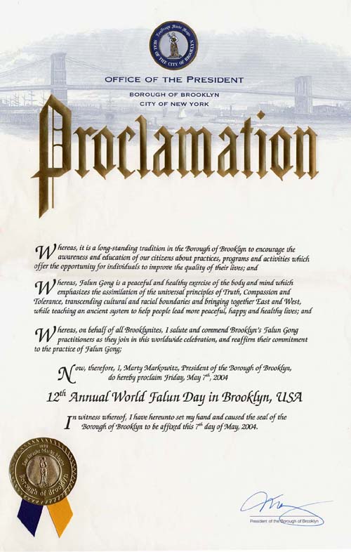 鉴于,我代表所有布碌仑区居民向布碌仑区的法轮功学员致敬并赞扬他们,此时,他们正参加世界性的庆祝,坚定他们修炼法轮功的信念。