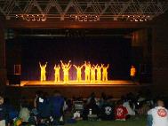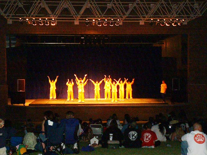 当晚8点左右,身着鲜艳黄色炼功服的法轮功学员出现在舞台上。美妙的音乐与优美的动作,吸引的全场观众的注意。