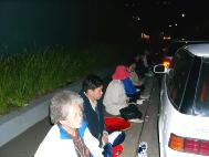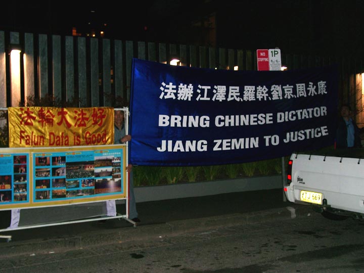 在黑夜中,天雨绵绵下、冬天的寒风中法轮功学员一字型的肃穆的请愿人排以及大型横幅格外引起过往行人的关注,有的停下来问真象并收了真象光碟及真象资料,有的过往车辆鸣笛致意或减车速细看横额上写的讯息并投来关注的目光。