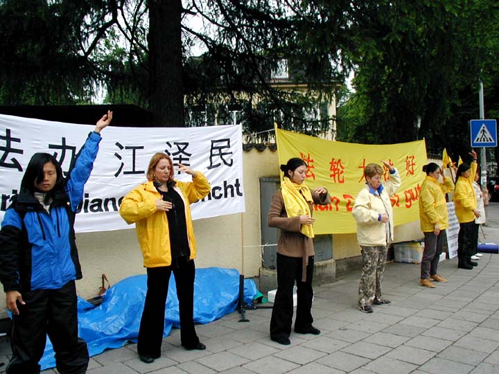 在活动过程中,中领馆试图对警察施压,说“法办江泽民”的横幅是带有侮辱性的,说中、德文横幅意思不一样,重演了几周前温家宝访问柏林时大使馆的闹剧。当时大使馆官员告诉柏林警察,法办的意思是判死刑的意思,警察经过自己的中德文翻译搞清了法办的意思,对中使馆无理要求不予理睬。慕尼黑的警察当场对横幅拍了照片,并请来了翻译,翻译告诉警察,横幅上的中德文意思是一样的,警察没对学员提出什么要求,中领馆的一场闹剧就这样收场。