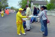 ![]() 法轮功学员的游行队伍 | ![]() 观众很高兴拿到法轮功的真象资料 | ![]() 莲花舞 |