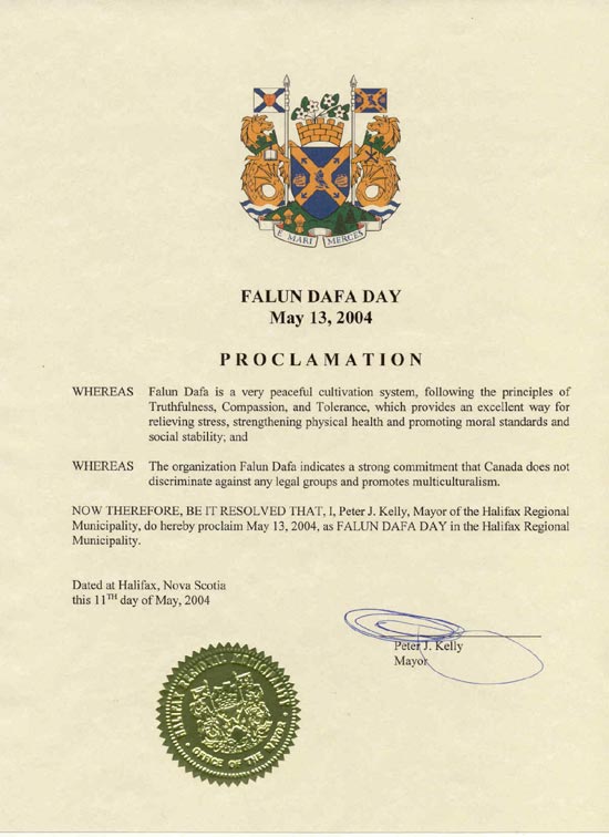 因此,我,彼得-凯利(Peter J. Kelly),哈利法克斯市(Halifax)市长,在此宣布2004年5月13日为哈利法克斯市的法轮大法日。