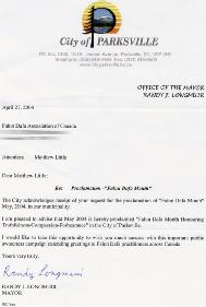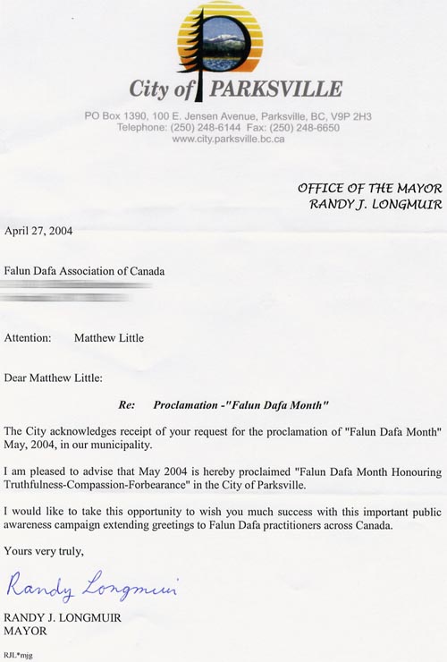 我很高兴的在此宣布2004年5月为我市“嘉奖真、善、忍的法轮大法月”。