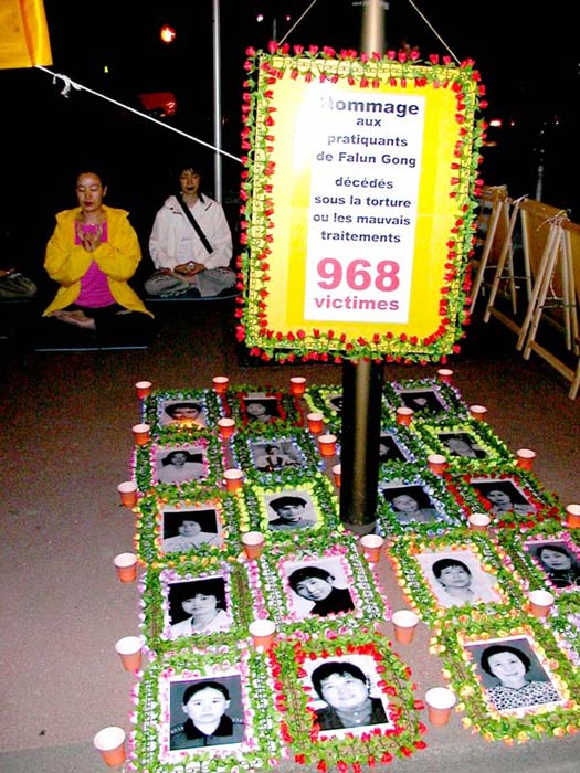在晚上中领馆前烛光守夜时,学员们以烛光守夜的方式纪念所有被迫害致死的同修。法轮功学员还被邀请讲述迫害经历,现在法国读书的原北京法轮功学员陈颖,讲述了她在回中国探亲时遭受的迫害经历,她因坚持修炼法轮功3次被警察非法关押,被关押期间遭受毒打和精神折磨,被强行注射损害神经的药物等。她的经历令在场的人们都落泪了。人们通过见证人法轮功学员陈颖的亲身经历,对中国当前对法轮功学员的迫害的残酷性有了更深刻的认识,他们呼吁人们要关注中国对人权的践踏,采取切实可行的方式制止迫害。