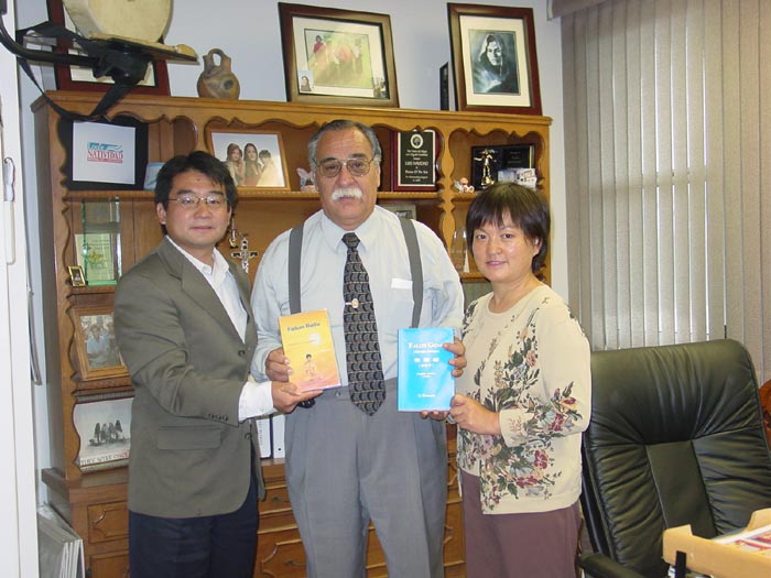 国立市(National City)议员路易斯-纳提维达(Luis Natividad)在他的办公室为本次活动颁发了褒奖状,并愉快地接受了学员赠送的大法书籍和教功录像带。为本次“南圣地亚哥郡法轮大法周”庆祝活动颁发褒奖状的政府官员还包括加州参议员丹尼斯-莫兰诺-杜臣尼(Denis Moreno Ducheny)、加州众议员雪莉-霍顿(Shirley Horton)、加州众议员胡安-瓦盖斯(Juan Vargas)以及圣地亚哥郡议会全体议员。