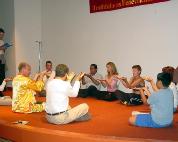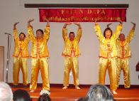 五位中西方法轮功学员为观众表演了五套法轮功功法,接下来学员们还進行了扇子舞和腰鼓表演。大法弟子的精彩表演赢得了在场观众的热烈掌声。最后,参加庆祝仪式的部分当地市民学习了全部五套法轮功功法。两位来自墨西哥的市民还表示希望学员到墨西哥去教法轮功。
