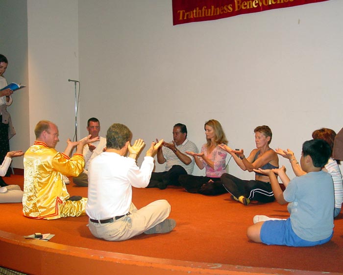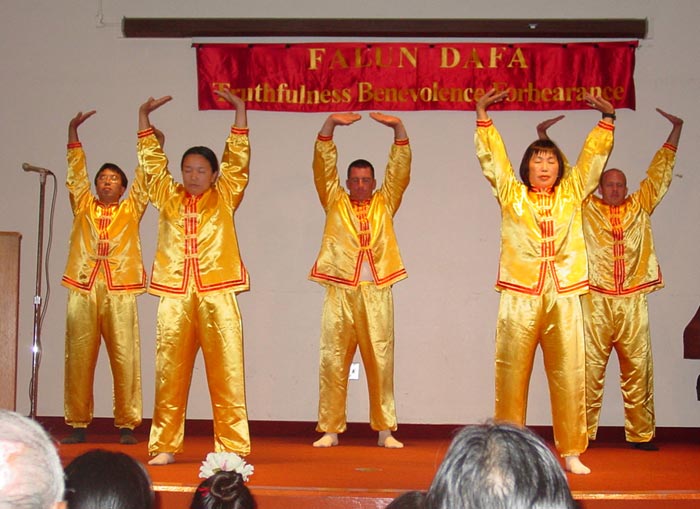 ![]() 参加庆祝仪式的观众 | ![]() 法轮功功法表演 | ![]() 参加庆祝仪式的市民学习法轮功功法 |