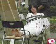这时电视屏幕上出现了法轮功学员演示酷刑的画面。报道说,自1999年起,超过1500名学员因炼法轮功而被迫害致死或虐杀。吕朝辉新婚三个月的妻子因为散发法轮功的真象资料而在一家劳教所里遭受了三年的酷刑折磨。吕告诉记者说,“她被剥夺睡眠达三天三夜。警察用电棒击打她,欲强迫她放弃对真、善、忍的信仰。”